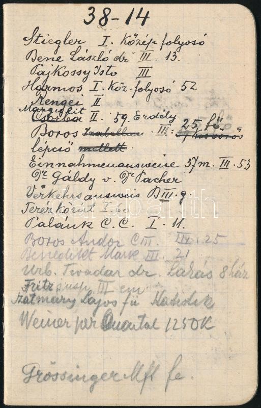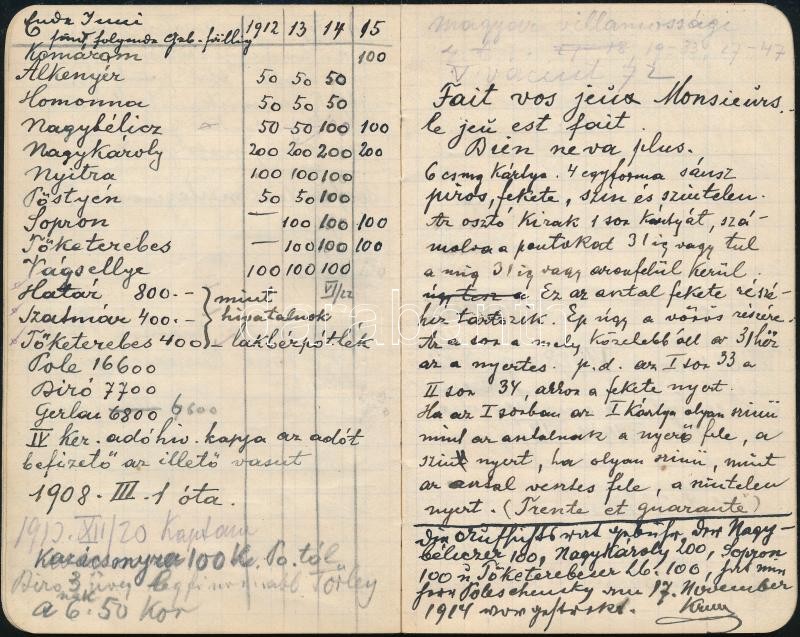 1914-1915 Azonosítatlan személy notesza, talán egy betegeskedő MÁV tisztviselő notesza, bejegyzésekkel, nevekkel, adatokkal, kiadásokkal, adókkal, az általa festett festményekre vonatkozó megjegyzésekkel, háborúra utaló megjegyzésekkel, betegségre feljegyzésekkel, nagyrészt magyarul, néhol egy-két német, egy francia, egy angol nyelvű sorral, borító nélkül, érdekes, átnézendő tétel, egy lapot kivágtak, 13x8 cm, 23 sztl. lev.,benne 11 beírt oldallal.