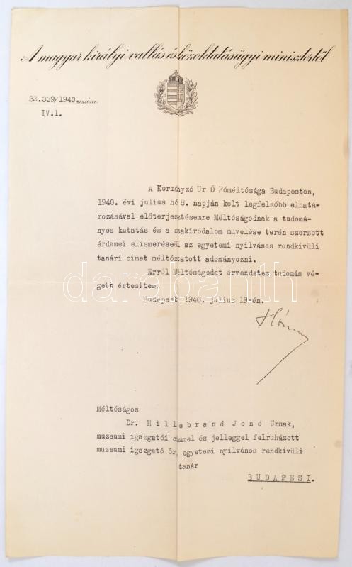 1940 Bp., Miniszteri kinevezés Dr. Hillebrand Jenőnek, kinevezésen Hóman Bálint (1885-1951) aláírásával