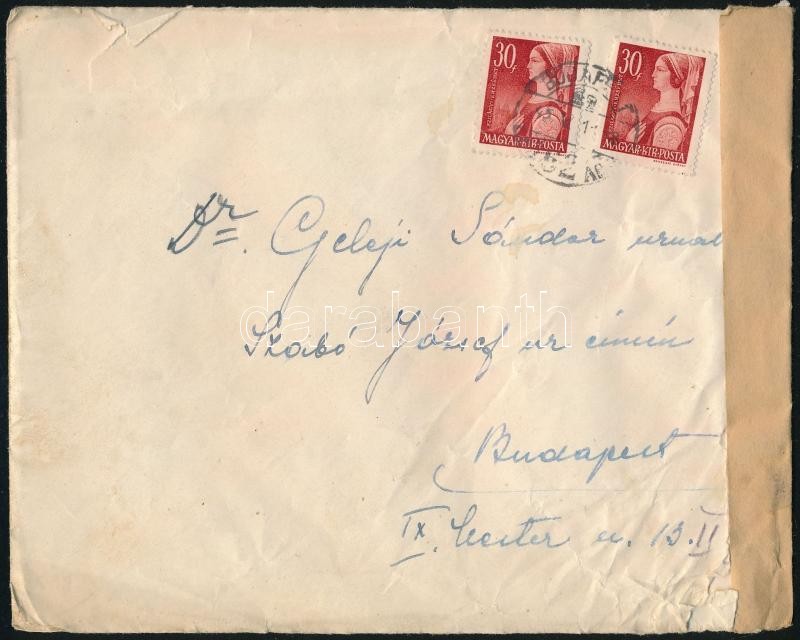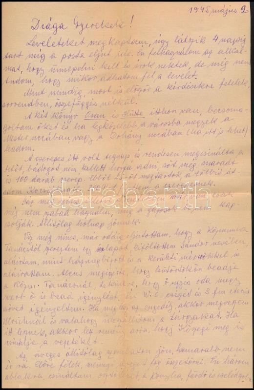 1945.V.2 levél V. ker (ma XIII. ker), Csanády u. 7-ből, amelyben a levélíró részletesen beszámol arról, hogy miként renoválják a házat és lakását a II. Világháború után, "víz még nincs". Valamint ír arról, hogy "oroszok már nem mutatkoznak a környéken", "romok alatt megtaláltam a kis ezüst készletet", közmunkára jelentkeztem" stb. Valamint ír egy banki alkalmazottról, aki olcsón jut élelmiszerhez a bankban. 4 kézzel írt oldal, eredeti borítékjában.