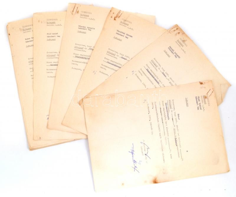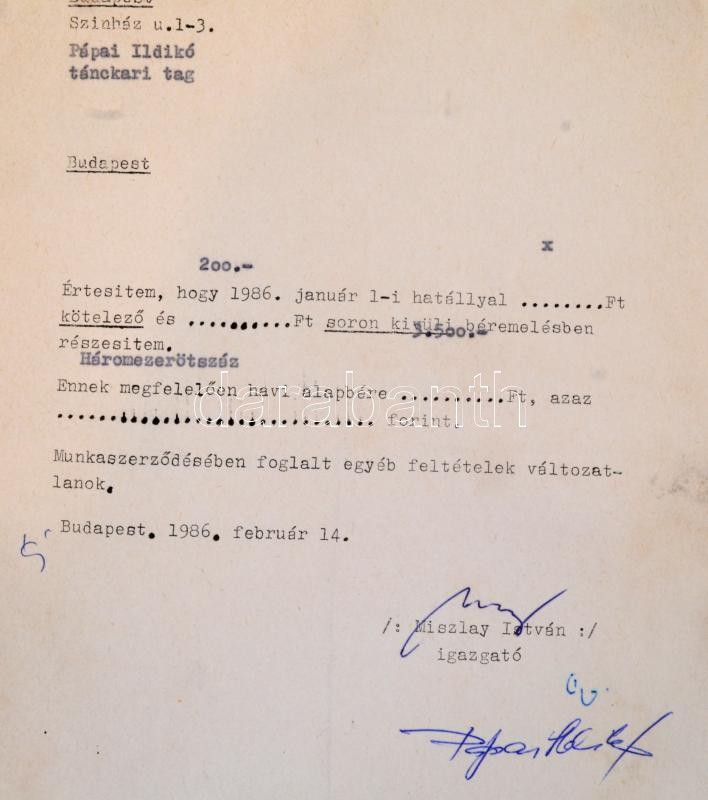 1986 Népszínház, béremelésről szóló iratok különböző zenészek és tánckari tagok részére, össz. 17 db. Mindegyiken Miszlay István (1930-2005) Jászai Mari-díjas magyar rendező, a színház igazgatójának autográf aláírásával, többségén a színház bélyegzőjével és a tagok aláírásával. Részben kopottas, foltos