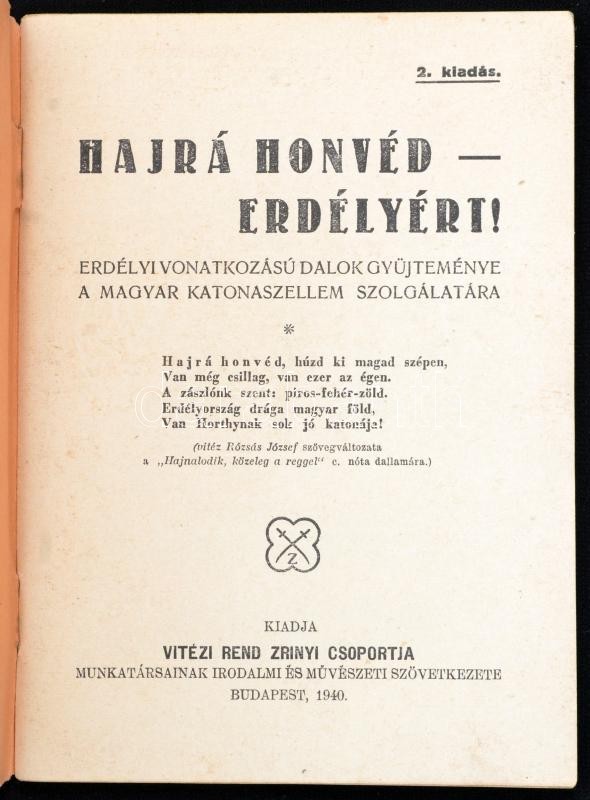 Hajrá hovéd - Erdélyért. Erdélyi vonatkozású dalok gyűjteménye a magyar katonaszellem szolgálatára. Bp., 1940. Vitézi rend. 64p. Papírborítékban