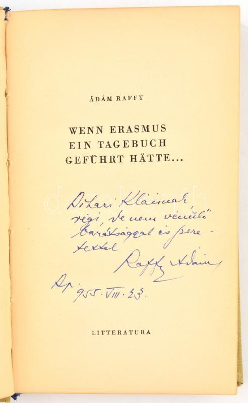 Raffy,Ádám: Wenn Erasmus ein Tagebuch geführt hätte... Bp.,1955., Athenaeum. Német nyelven. Kiadói egészvászon-kötés. A szerző által dedikált.