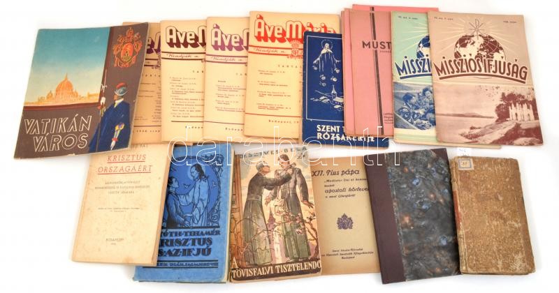 Vegyes nagy vallási könyv, folyóirat és prospektus tétel: D. Tóth Tihamér: Levelek diákjaimhoz: Ne igyál! . Bp.,1923, Szerzői kiadás,(Élet-ny.), 59+40 p. Negyedik kiadás. Átkötött félvászon-kötés, az eredeti borítókat bekötötték. + Jean Claude Adrien Helvétius: Der wahre Sinn des Natursystemes: Ein hinterlassenes Werk. Frankfurt, 1783. 142p. Kézzel írt bejegyzésekkel. korabeli papírkötésben, laza fűzéssel, sérült gerinccel / With loose binding + dr. Halász Pál: Krisztus országáért - Lelkigyakorlat-tervezet egyházközsségi és katolikus egyesületi vezetők számára. Bp., 1940, Actio Catholica. Kiadói papírkötés + Dr. Tóth Tihamér: Krisztus és az ifjú. Levelek diákjaimhoz VIII. Bp., én. Szerzői. Kiadói papírkötés, ajándékozási sorokkal. + Szíves Béla Dr.: A tövisfalvi tisztelendő. Bp., 1948, Korda. Kiadói papírkjötés, kiadói foltos védőborítóval. + XI. Pius pápa apostoli körlevele a liturgiáról. Bp.,1948, Szent István-Társulat. Kiadói papírkötés, kissé szakadt borítóval. + 1938-43, Áve Mária folyóirat 5 száma, jó állapotban + 1936, Missziós Ifjúság lap 2 száma, kissé foltos borítóval + Szent Terézke Rózsakertje, karácsonyi szám, 1935 dec. szakadt és hiányos borítóval, foltos lapokkal.+ 1935-42 Mustármag. Evangéliumi hitmélyítő folyóirat.5 száma + Vatikán város turisztikai prospektus, Róma, 1940, gazdagon illusztrált, hajtásnyommal.