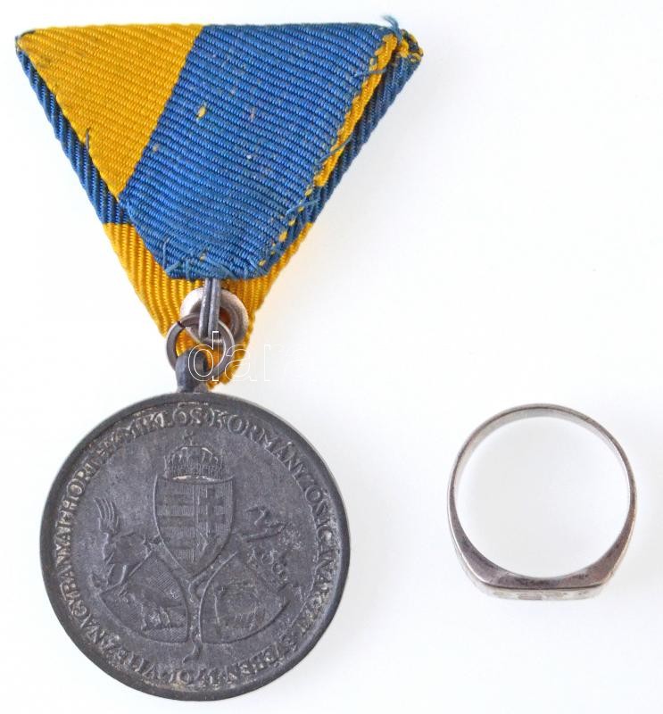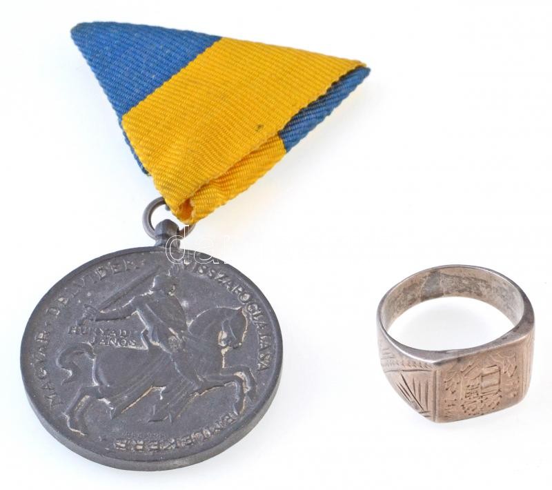 Description: 1941. "Délvidéki Emlékérem" cink emlékérem mellszalaggal. Szign.: BERÁN L. + 1939-1942. Fém katonai emlék gyűrű a világháborúból magyar címerrel és évszámmal T:2 Hungary 1941. "Commemorative Medal for the Return of Southern Hungary" zinc medal ribbon. Sign.:BERÁN L. + 1939-1942. Metal military memorial ring from the World War with Hungarian coat of arms and year C:XF NMK 429.