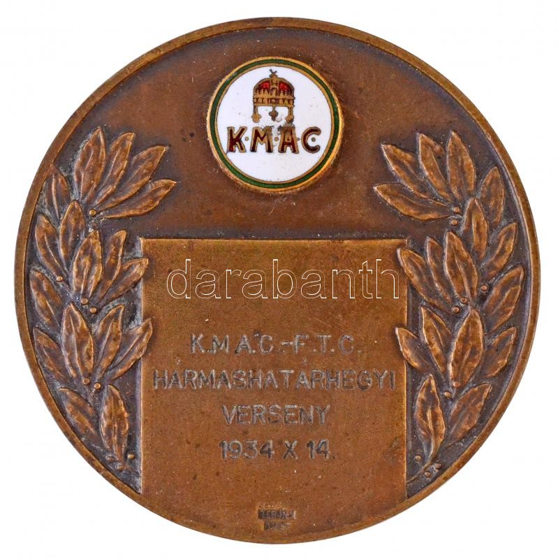 Description: 1934. "K.M.A.C.-F.T.C. Hármashatárhegyi verseny 1934 X 14." Br díjérem a KMAC (Királyi Magyar Automobil Club) zománcozott címerével, "BERÁN N BPEST" gyártói jelzéssel (50mm) T:2 zománchiba