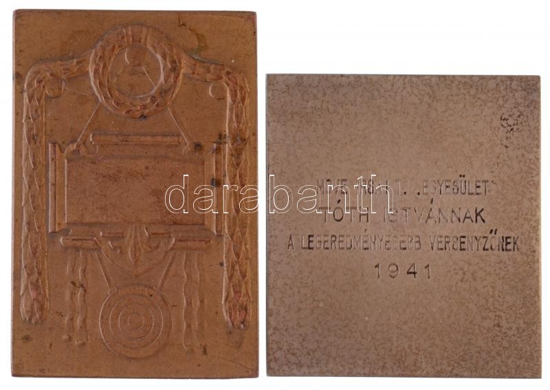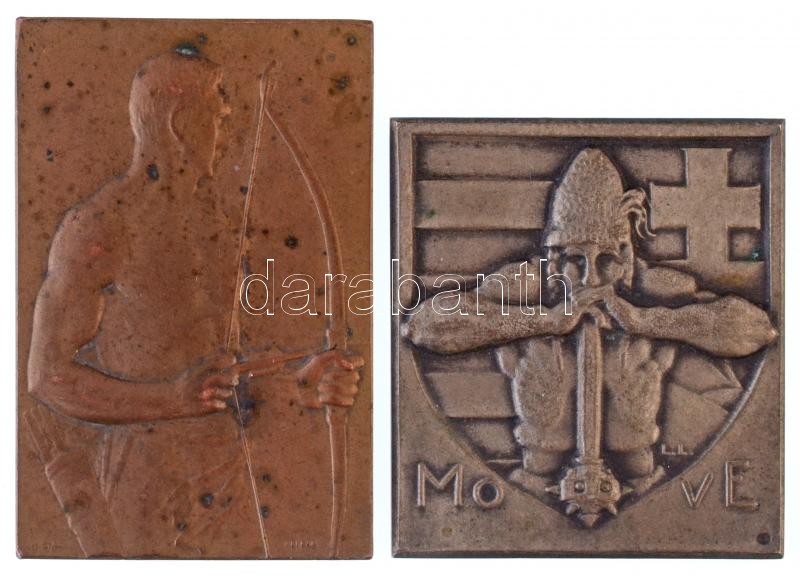 Berán Lajos (1882-1943) ~1930. "Íjász" Br sportplakett "S.G.A." gyártói jelzéssel (40x60mm) + 1941. "MOVE (Magyar Országos Véderő Egylet) / MOVE Irsai T. S. Egyesület Tóth Istvánnak a legeredményesebb versenyzőnek 1941" fém plakett. Szign.: L.L. (49x45mm) T:2-