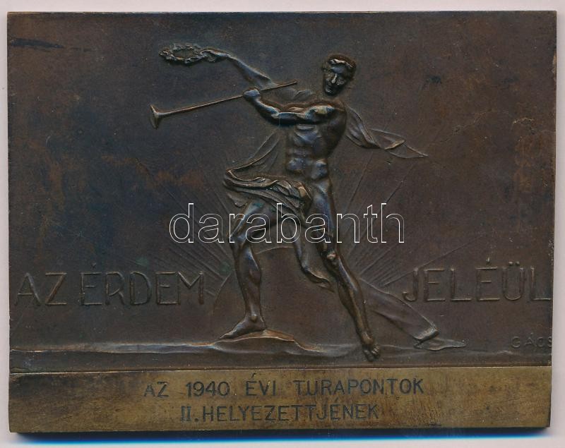 Description: Gács Lajos (1905-1981) 1940. "Az érdem jeléül" egyoldalas Br sport emlékplakett, előlapon gravírozva "Az 1940 évi túrapontok II. helyezettjének" (63x84mm) T:1-,2