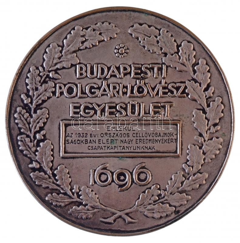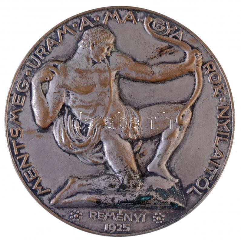Reményi József (1887-1977) 1925. "Ments meg Uram a magyarok nyilaitól / Budapesti Polgári Lövész Egyesület - Emlékül az 1932. évi országos céllövőbajnokságokban elért nagy eredményekért csapatkapitányunknak" ezüstözött Br emlékérem (79mm) T:2,2- Hungary 1925. "Lord, save us from the arrows of the Hungarians / Civilian Rifle Association of Budapest - To our team captain for the great achievements of the National Target Shooting Championships in 1932" silvered Br medallion. Sign.: József Reményi (79mm) C:XF,VF HP 4387.