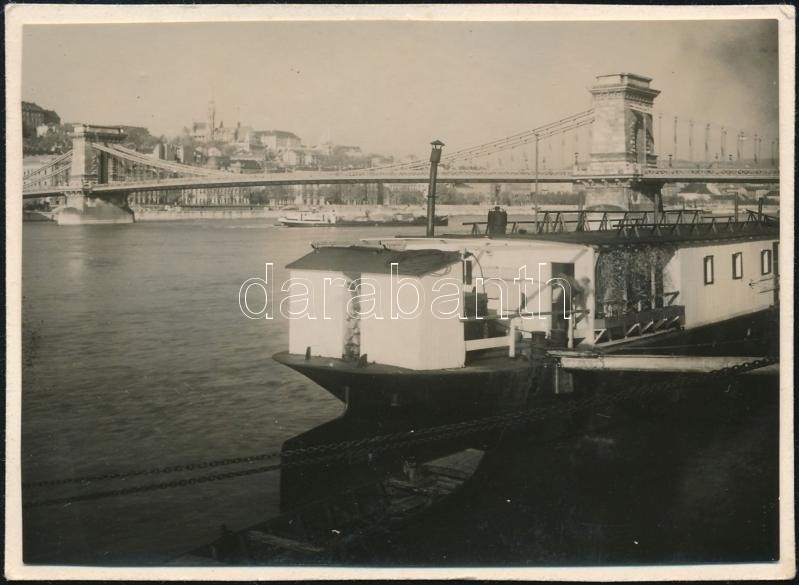 Description: 1930 Kinszki Imre (1901-1945) budapesti fotóművész jelzés nélküli, de általa feliratozott, vintage fotója (Bp., Lánchíd, ez a 757. sz. felvétele), az egykori tároló album kartonjára ragasztva, 6x8,5 cm
