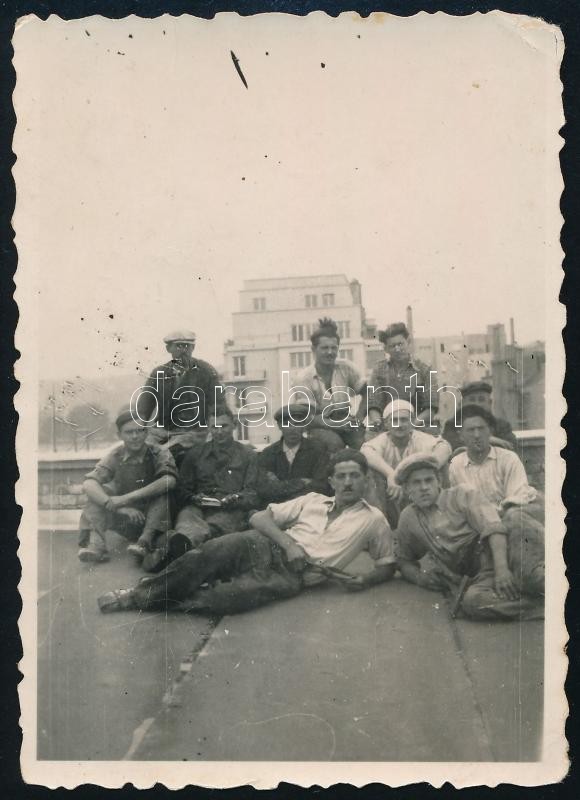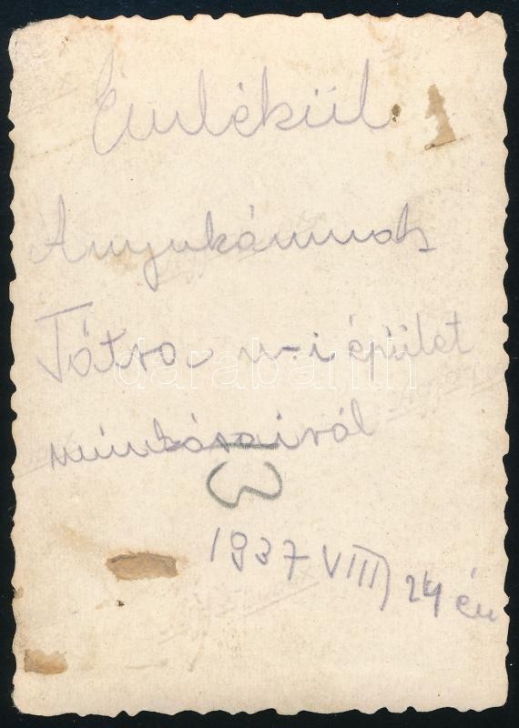 1937 Tátra u.-i épület munkásairól készült fotó, hátulján írás 8,5x6 cm
