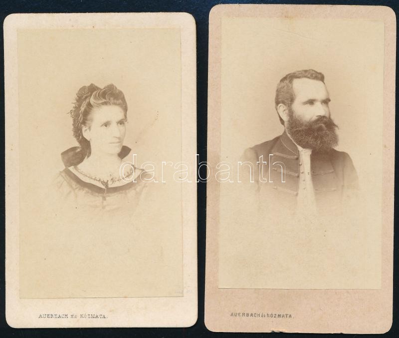 Description: cca 1870-1880 Makó, Ott Károly makói vas-, fűszer- és vegyesáru kereskedő, és felesége Ott Károlyné Kristóffy Lujza keményhátú fotói, 2 db, Arad, Auerbach (Miksa) és Kózmata (Ferenc) műterméből, 10x6 cmx2