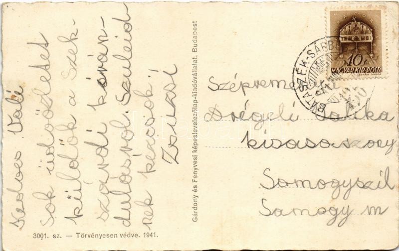 Description: 1941 Szekszárd, Park, Római katolikus templom, Vármegyeháza, Garay tér, Pénzügyi palota, piac + "BÁTASZÉK - SÁRBOGÁRD 136" vasúti mozgóposta bélyegző (EK)