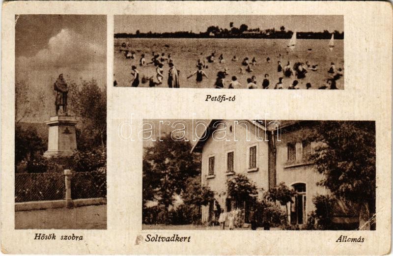 1952 Soltvadkert, Petőfi tó, fürdőzők, Hősök szobra, emlékmű, Vasútállomás. Csóti Ferenc kiadása (EB)