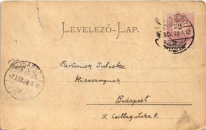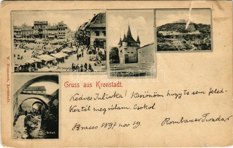 1897 (Vorläufer!) Brassó, Kronstadt, Brasov; Purzengasse, Katherinentor, Schlossberg, Die Graft / Kapu utca, piaci árusok, tömeg, üzletek, Katalin-kapu, Graft bástya és sétány, Fellegvár. W. Hiemesch kiadása / street view, market vendors, crowd, shops, city gate, bastion, promenade, castle (szakadás / tear)