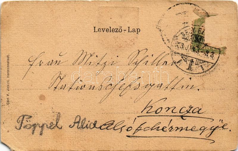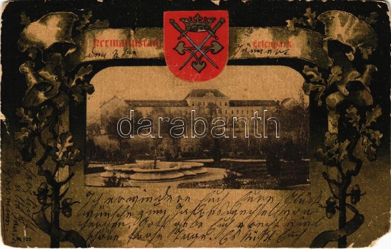 Description: 1903 Nagyszeben, Hermannstadt, Sibiu; Erlenpark mit Garnisons-Spital / Osztrák-magyar helyőrségi kórház és az Erlen park. Carl F. Jickeli kiadása. Szecessziós címeres litho keret / Austro-Hungarian K.u.K. military garrison hospital with park. K. 105. Art Nouveau, coat of arms, litho frame (EM)