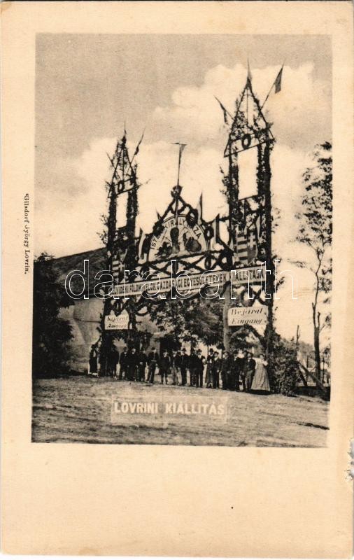 Description: Lovrin, Délvidéki Földmívelők Gazdasági Egyesületének Kiállítása, bejárat és kijárat, magyar címer, "Isten, király, haza" felirat. Gilsdorf György kiadása / Agricultural Exhibition in Lovrin, Hungarian coat of arms (b)