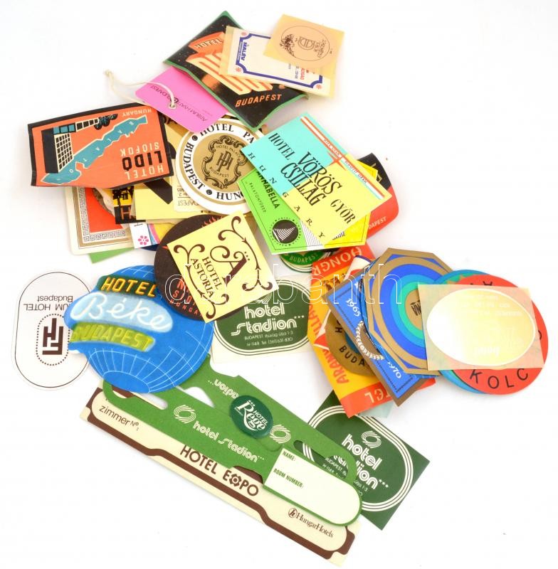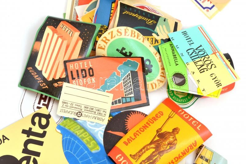 76 db bőröndcímke és matrica (Hotel Annabella - Balatonfüred, Grand Hotel Gellért - Budapest, Hotel Vörös Csillag - Győr, Hotel Béke - Budapest stb.)