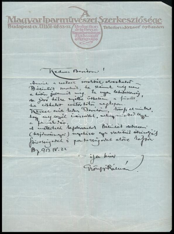 1913 Györgyi Kálmán (1860-1930) művészeti író, a Magyar Iparművészet s... https://www.darabanth.com/en/372-Online-auction/372.0/Art-and-other-collectibles/Historical-documents-manuscripts~18/1913-Gyorgyi-Kalman-1860-1930-muveszeti-iro-a-Magyar-Iparmuveszet-szerkesztojenek-auto~II2163333