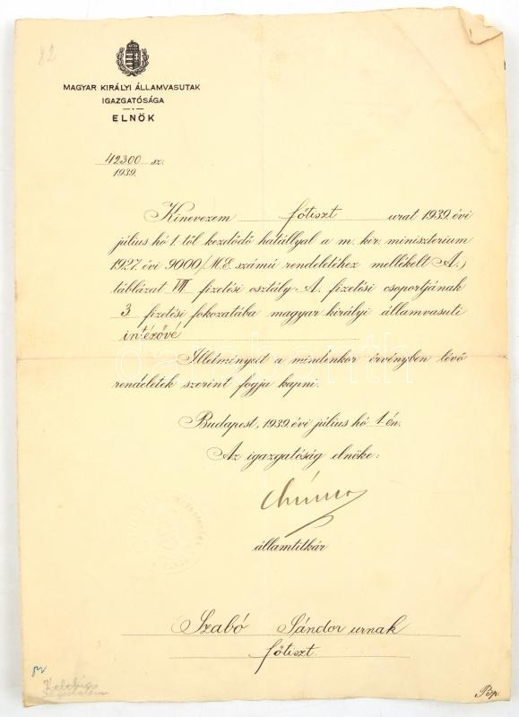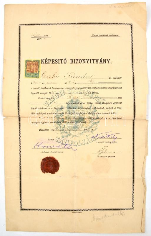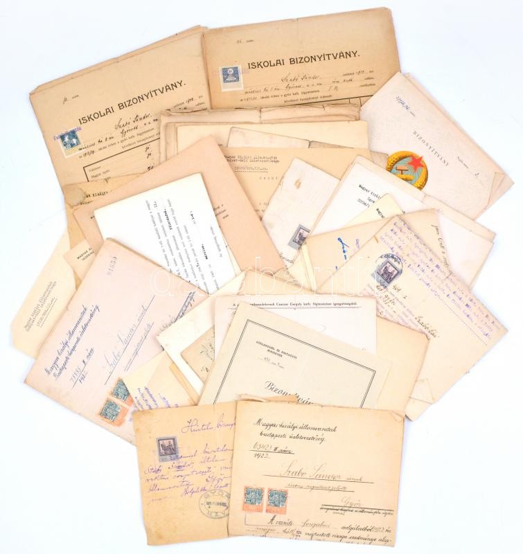 cca 1913-55 MÁV vasutas főtiszt, intéző, 1939-ban Kelebia állomásfőnöke, hagyatéka, több mint 40 db irat és egyéb papírrégiség. Többek közt 1939 M. Kir. Államvasutak igazgatósága, elnök fejléces papírján kinevezés intézővé, igazgatóság elnöke, államtitkár aláírásával és szárazpecsétjével és egyéb fizetési vagy kinevezési papírok + 1925 vasúti tisztképző tanfolyam bizonyítvány, viaszpecséttel és 5000 korona okmánybélyeggel és egyéb vasutas képesítési bizonyítványok+ 1922-39 Győr és Kelebia, 2db hatósági erkölcsi bizonyítvány + Fonciere Általános Biztosító Intézet vegyes tőkebiztosítás kötvény, díszes fejléces papíron és hozzá tartozó levelek, iskolai bizonyítványok a győri szentbenedekrendi kath. főgimnáziumból. Vegyes állapotban.
