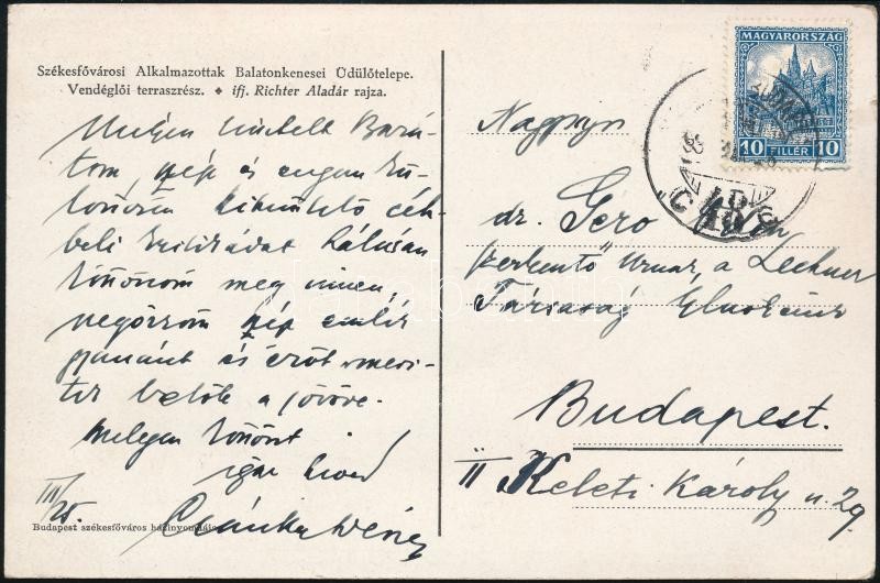 cca 1930 Csánky Dénes (1885-1972) festőművész, a Szépművészeti Múzeum későbbi igazgatója autográf sorai Gerő Ödönnek (1863-1939), a Pester Lloyd műkritikusának, a Lechner Társaság elnökének címezve, amelyben hálásan megköszöni a céhbeli kritikákat, amelyből erőt merít a jövőre. Csánky a ,,Céhbeliek" Magyar Képzőművészek Társasága tagja volt, 1932-ben aranyérmet nyert a céhbeliek tárlatán. Székesfővárosi Alkalmazottak Balatonkenesei Üdülőtelepe, Ifj. Richter Aladár rajza képeslapon.