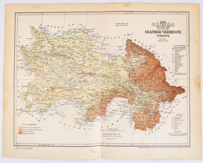Description: 1893 Szatmár vármegye térképe, tervezte: Gönczy Pál, Posner Károly Lajos és Fia térképészeti műintézetének metszése és nyomása, Pallas Nagy Lexikona, 1:410.000, 23,5×30 cm
