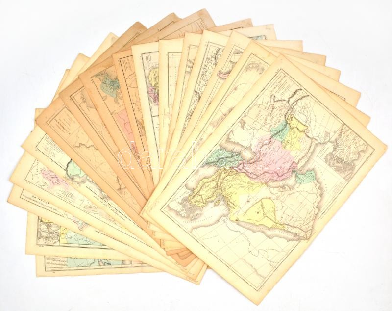 Description: cca 1876 Atlas Universel et Classique De Géographie Ancienne, Romaine, Du Moyen Age, Moderne et Contemporaine c. atlasz 16 térképlapja, közte Európa és világtérképek. Berlin-Paris, Librairie Classique d'Eugene, változó állapotban, 33x47 cm