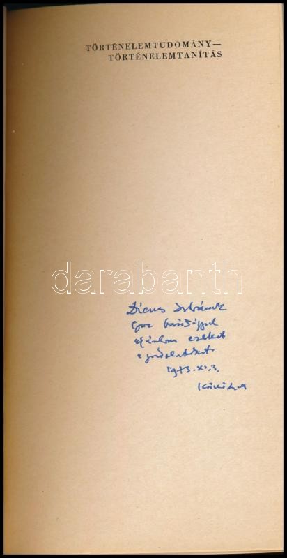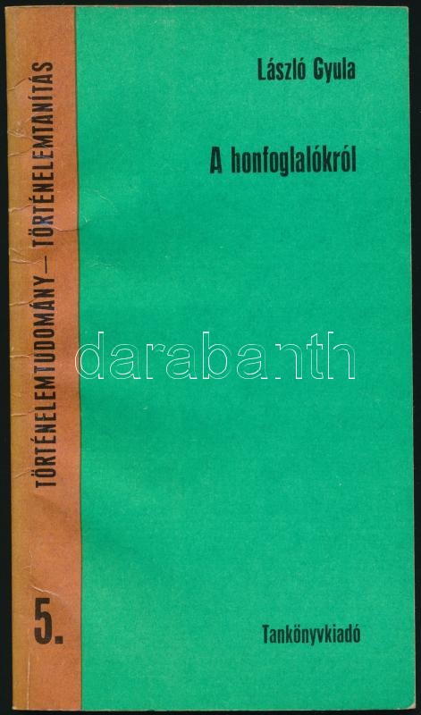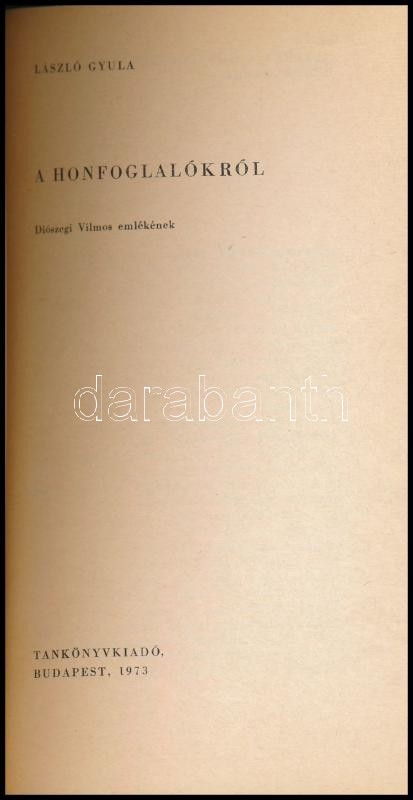 László Gyula: A honfoglalókról. Történelemtudomány-történelemtanítás. 5. Bp.,1973., Tankönyvkiadó. Első kiadás. Kiadói papírkötés. László Gyula (1910-1998) régész-történész, egyetemi tanár, képzőművész, egyetemi tanár által Dienes István (1929-1995) régész, muzeológus, László Gyula tanítványa, barátja részére dedikált példány, dátumozva (1973. XI. 3.)