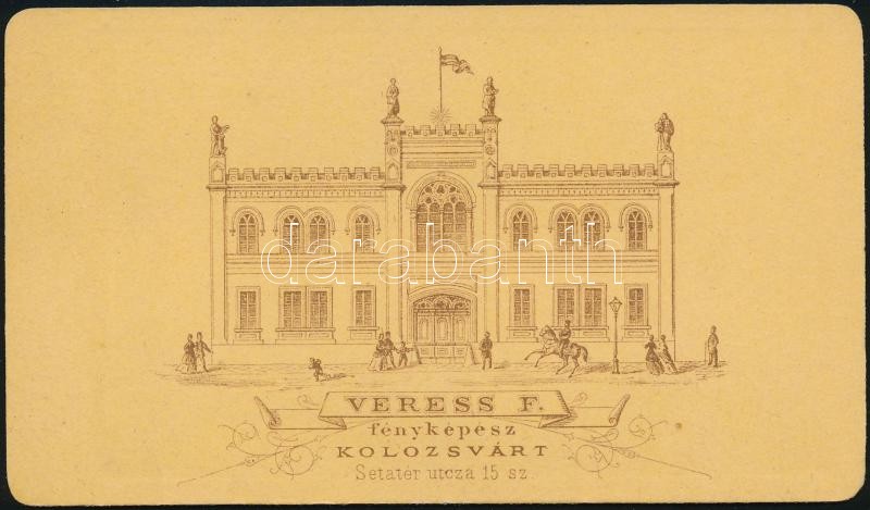 cca 1870 Galgóczy Károlyné portréja, keményhátú fotó Veress Ferenc (1832-1916) kolozsvári műterméből, hátoldalon a műterem képével, 10,5×6 cm