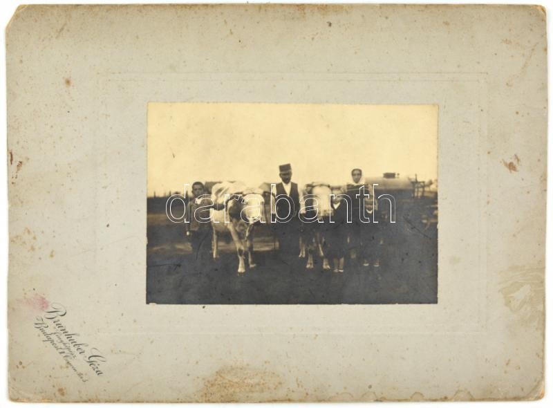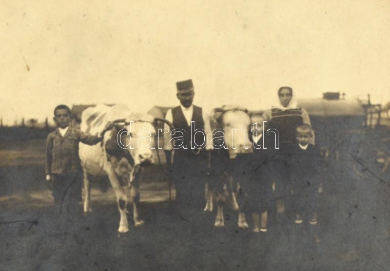 cca 1910-1920 Falusi család ökrökkel, kartonra kasírozott fotó Brunhub...