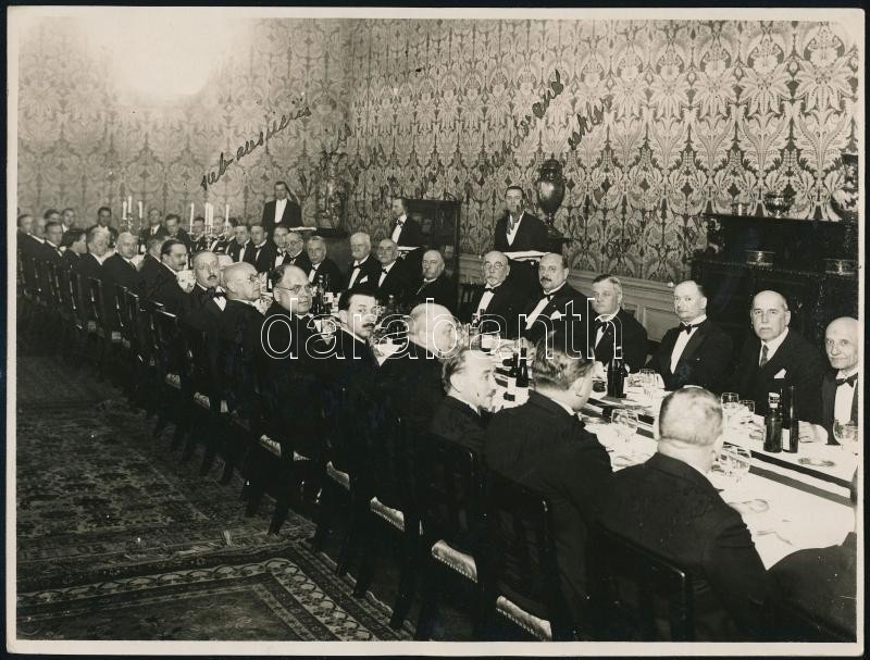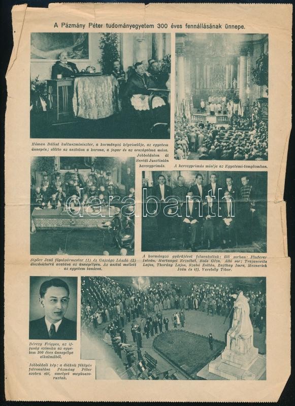 cca 1935 Gajzágó László díszdoktorrá avatásáról készült fotó, Kaulich Rudolf műterméből, hátulján pecséttel jelzett, a fotó eleje és a hátulja feliratozva, Hóman Bálint kultuszminiszter is szerepel rajta, 18x23,5 cm + újságcikk Gajzágó László díszdoktorrá avatásáról és a Pázmány Péter Tudományegyetem 300 éves fennállásának ünnepéről +Gajzágó László apjának, dr. Gajzágó Béla ítélőtáblai tanácselnöknek küldött képeslap Korfuról