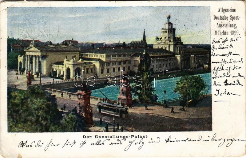 1899 München, Munich; Allgemeine Deutsche Sport-Ausstellung München 1899. Der Ausstellungspalast / sports exhibition palace, tram. C. Andelfinger & Cie. Kunstanstalt No. 401. (Offizielle Karte No. 8.) + 5 Pfennig Emb. Ga. (EB)