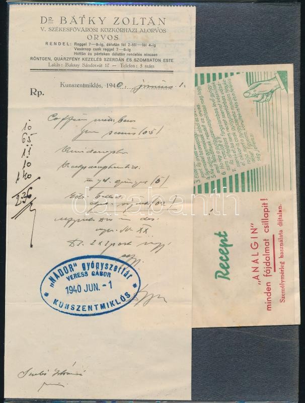 cca 1940 Nádor gyógyszertár, Veress Gábor, Kunszentmiklós recept tasak és recept