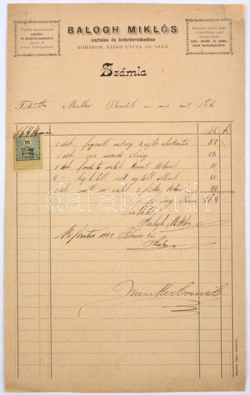 1905 Komárom, Balogh Miklós asztalos és bútorkereskedésének fejléces számlája, 10f okmánybélyeggel, restaurált