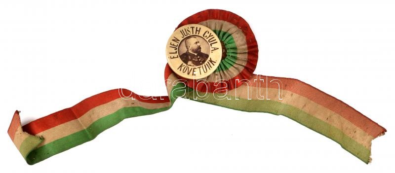 cca 1900 Justh Gyula választási jelvény, nemzeti színű szalagon, kopot...