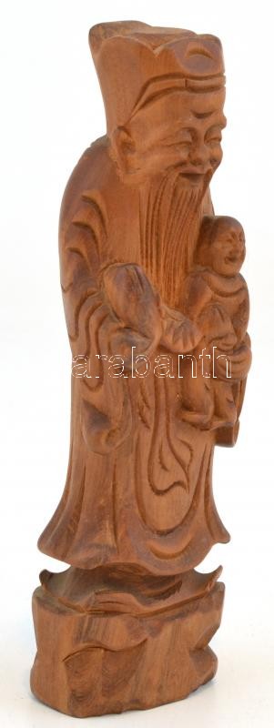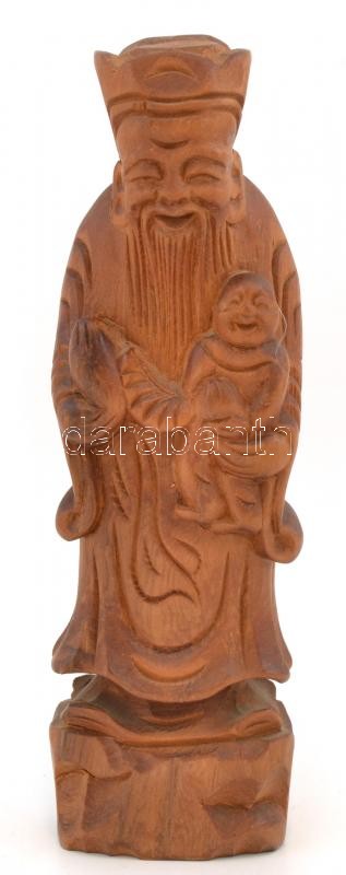 Keleti bölcs nevető Buddhával faragott fa szobrocska, 15 cm