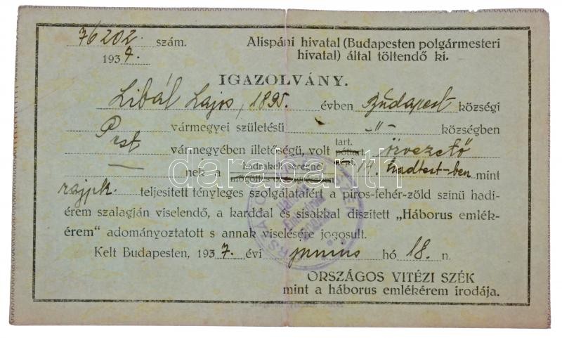 Description: 1929. "Magyar Háborús Emlékérem kardokkal, sisakkal" kitüntetés miniatűrje peremen "BRONZE" beütéssel és 1937-es viselői igazolvány (rajta szakadás) T:1-