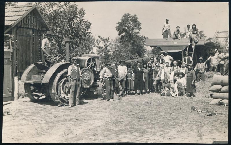 1943 augusztus 3. Bácskossuthfalva, az Albrecht fotó pecsétjével jelzett riportfotó cséplés idején, 8,4x13,3 cm
