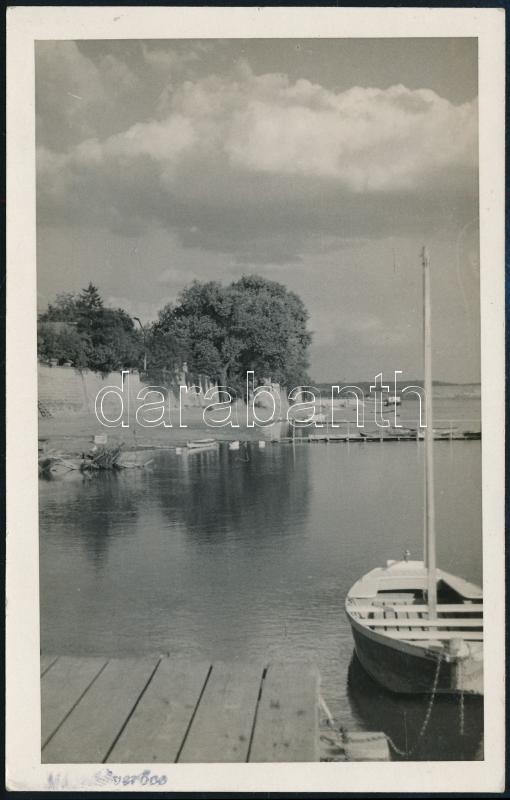 Description: cca 1935 Kinszki Imre (1901-1945) budapesti fotóművész hagyatékából, jelzés nélküli vintage fotó (Nógrádverőce kikötője, fotólap elmosódott felirattal), 13,8x8,9 cm