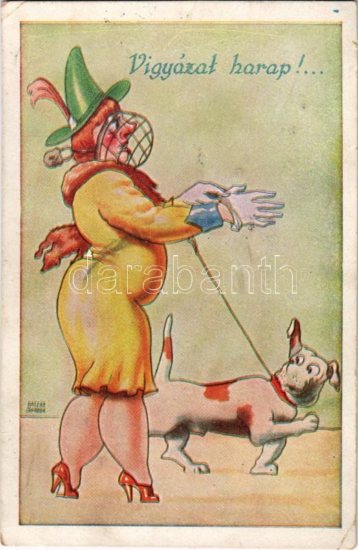 Vigyázat harap! / lady wearing a muzzle, humour s: Kaszás Jámbor (EK)