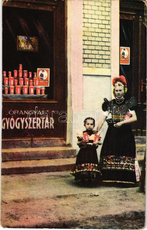 Mezőtúr, Őrangyal gyógyszertár, magyar népviseletbe öltözött anya és lány Ovomaltine vásárláskor