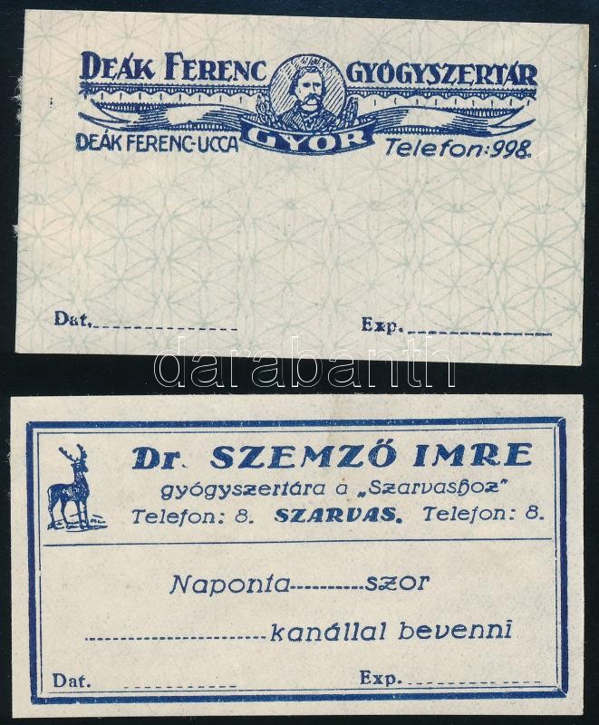 Deák Ferenc Gyógyszertár Győr és Dr. Szemző Imre Szarvas 2db gyógyszertári címke