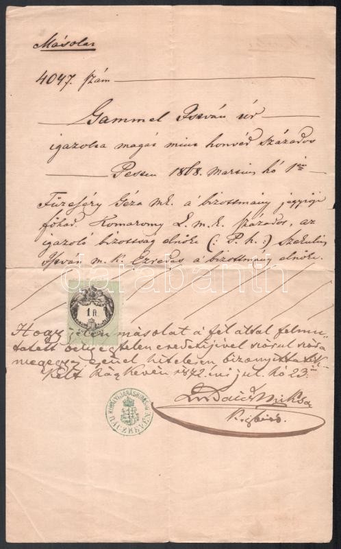1868 Gammel István 1848-as honvéd százados igazolásának korabeli hitel...