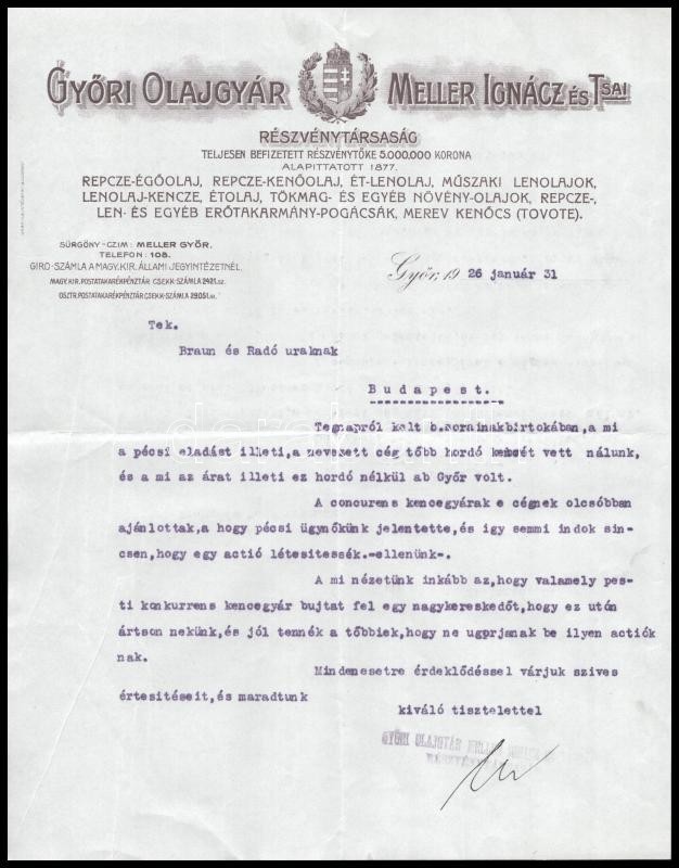1926 Győr, Győri Olajgyár Meller Ignác és Társai Részvénytársaság fejl...