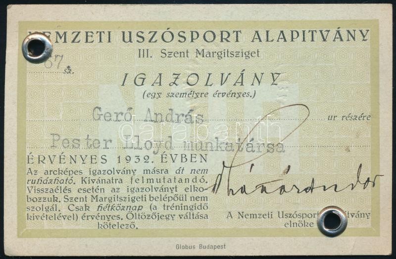 Description: 1932 Gerő András, Gerő Ödön (1863-1939) újságíró, a Pester Lloyd újságírója fiának fényképes igazolványa a Nemzeti Uszósport Alapítvány III. Szent Margitszigetre. Gerő András 1932-ben ugyancsak mint a Pester Lloyd munkatársa kapta az igazolványt. A Nemzeti Uszósport Alapítvány elnöke által aláírt.