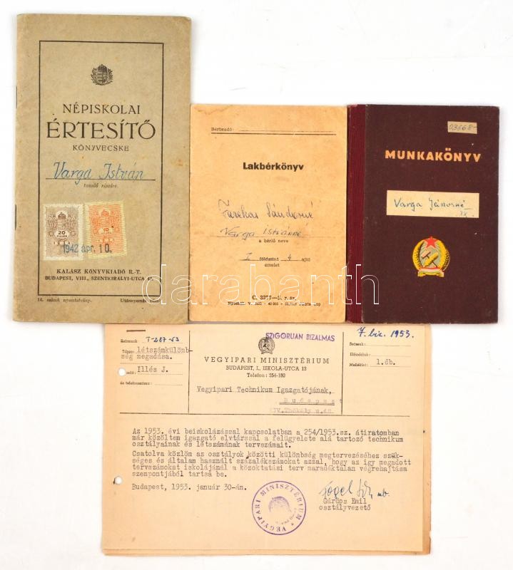 Description: cca 1940-65 Vegyes okmány és irat tétel, össz. 4 db: 1953 Vegyipari minisztérium által a Vegyipari Technikum, Bp. igazgatójának küldött szigorúan bizalmas irat létszámkülönbség megadása ügyében. 1940-42 Népiskolai értesítő, 2 db okmánybélyeggel. cca 1968 , lakbérkönyv. 1965 Munkakönyv.
