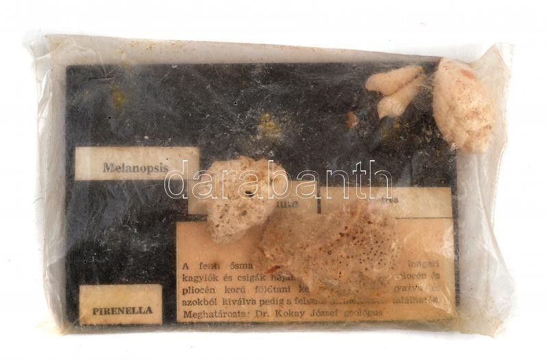 Description: 4 db 5-15 milló éves ősmaradvány (Melanopsis, Lithothamnium, Ostrea, Piranella) a fertőrákosi kőfejtőből, meghatározta Dr. Kókay József geológus, feliratozott, eredeti csomagolásban