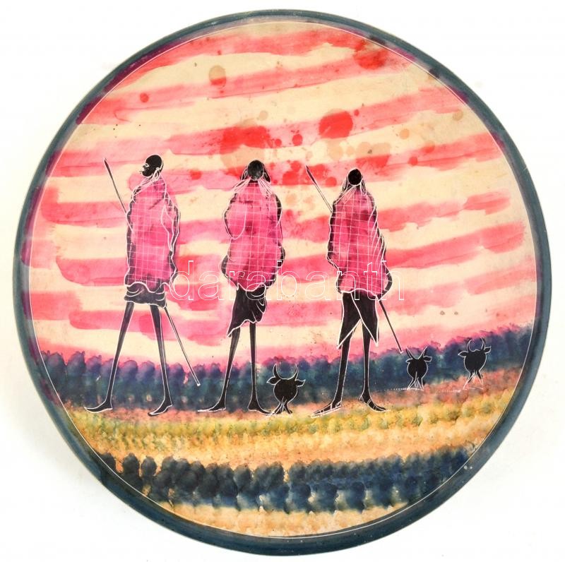 Bennszülötteket ábrázoló kézzel festett zsírkő dísztál, viaszfoltokkal, d: 31 cm
