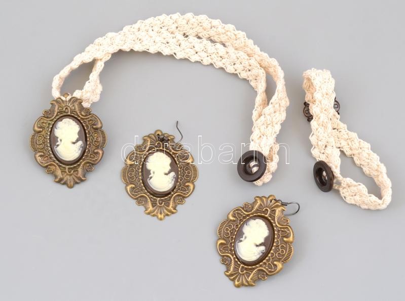 Kámeával díszített fém bizsu szett. Fülbevaló pár, 5x4 cm. Karkötő és nyaklánc kézi horgolással.