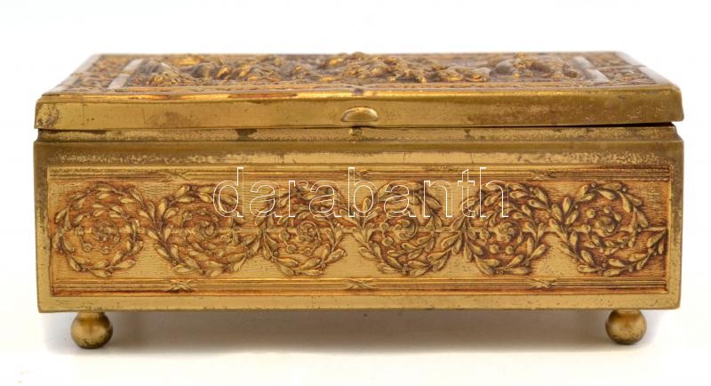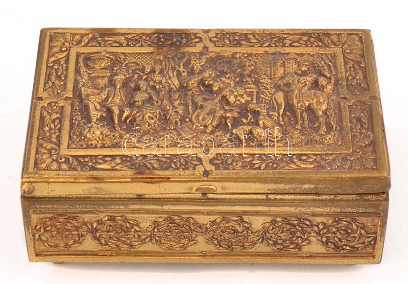 Réz borítású dobozka, mulatós jelenettel. Jelzett. 9x6x4 cm