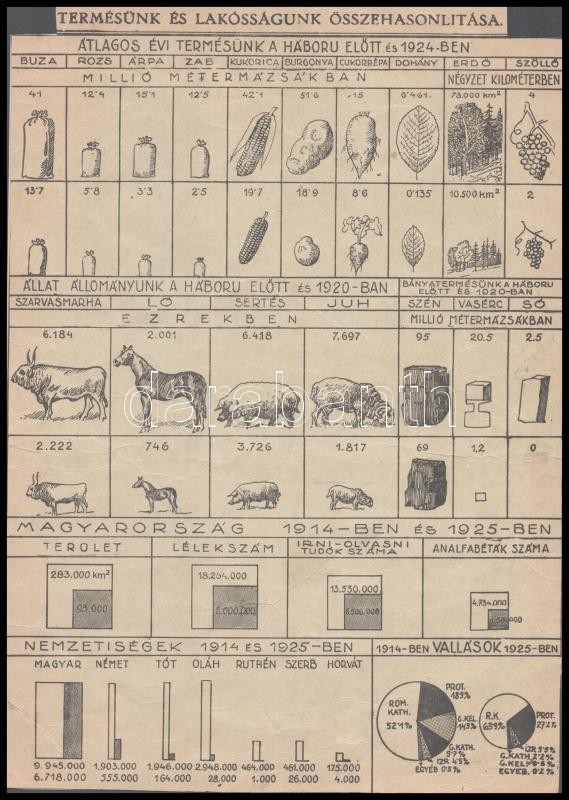 Description: Magyarország politikai térképe. 1:2.500.000. Bp, Posner. Hajtásnyommal, 27x40,5 cm. + cca 1925-1930 Termésünk és lakosságunk összehasonlítása, táblázat, 29x20,5 cm